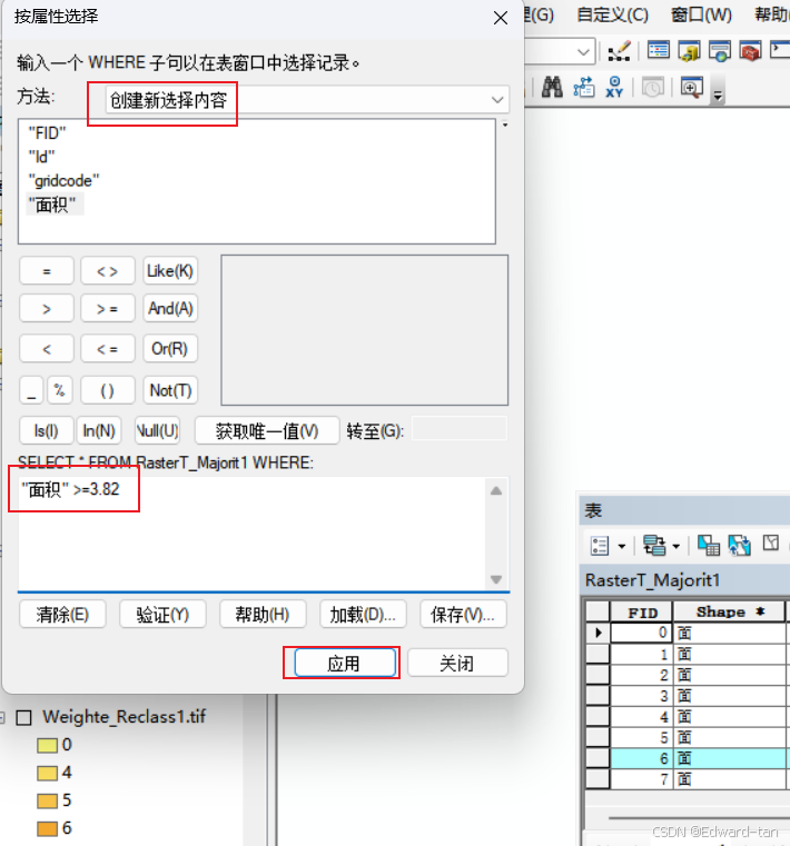 输入表达式:"面积">=3.82(书上是要大于等于5,但我这边最大只要3.82948,选择面积最大那个就行)