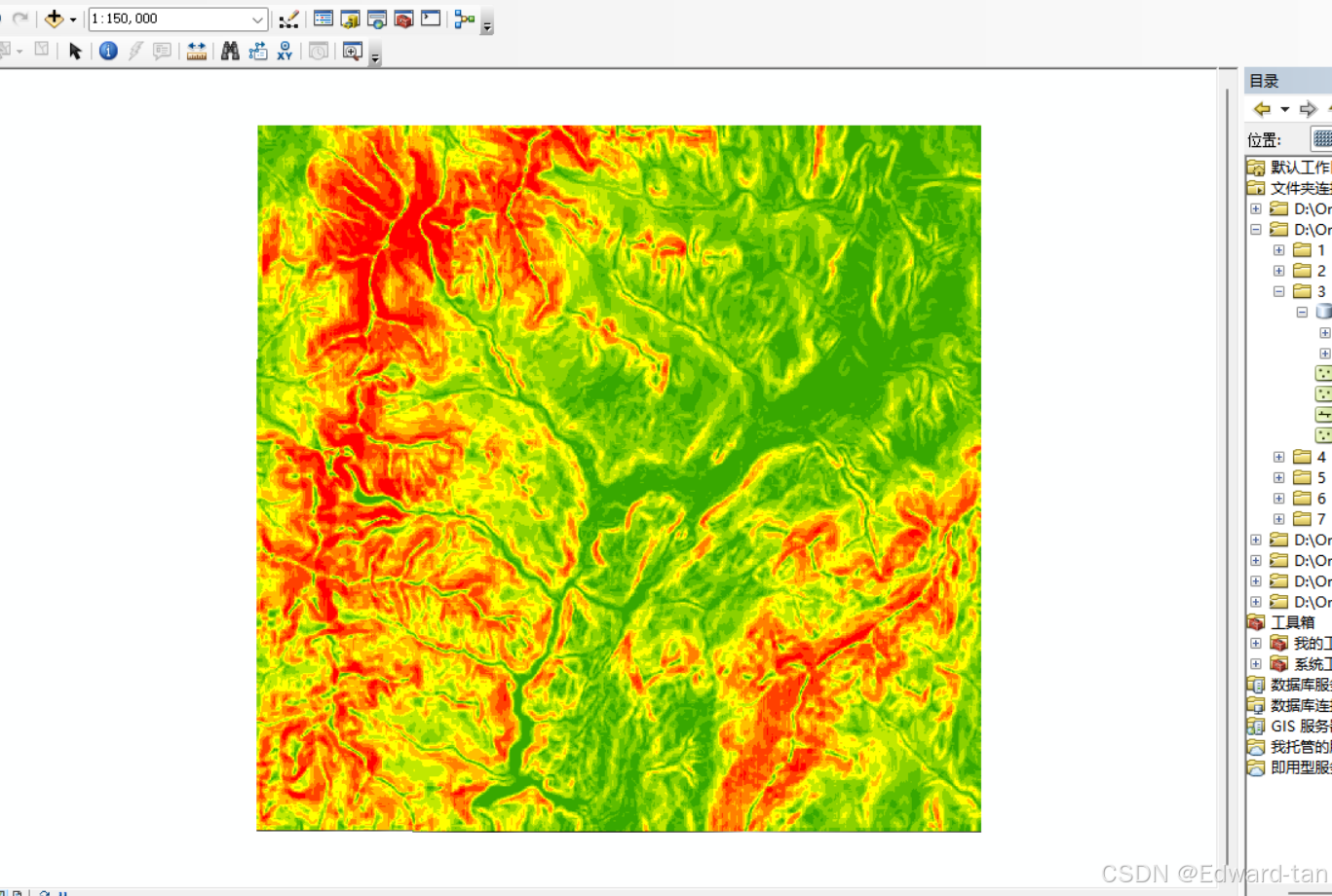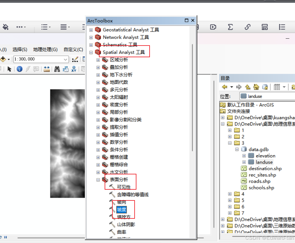 点击ArcToolbox中的【空间分析】--【表面分析】【坡度】。