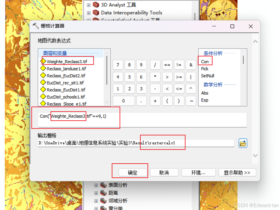 在“栅格计算器”对话框中,点击【条件分析】中的Con函数,点击【图层与变量】中的Weighte_Reclass3.tif,确保输入地图代数表达式为“Con("Weighte_Reclass3.tif"==9,1)",此公式的意思是,如果栅格Weighte_Reclass3.tif中的像元值等于9,则输出像元值为1;否则,不输出任何值(默认情况下,不满足条件的地方将被赋予NoData值)。选择输出地址,点击确定。
