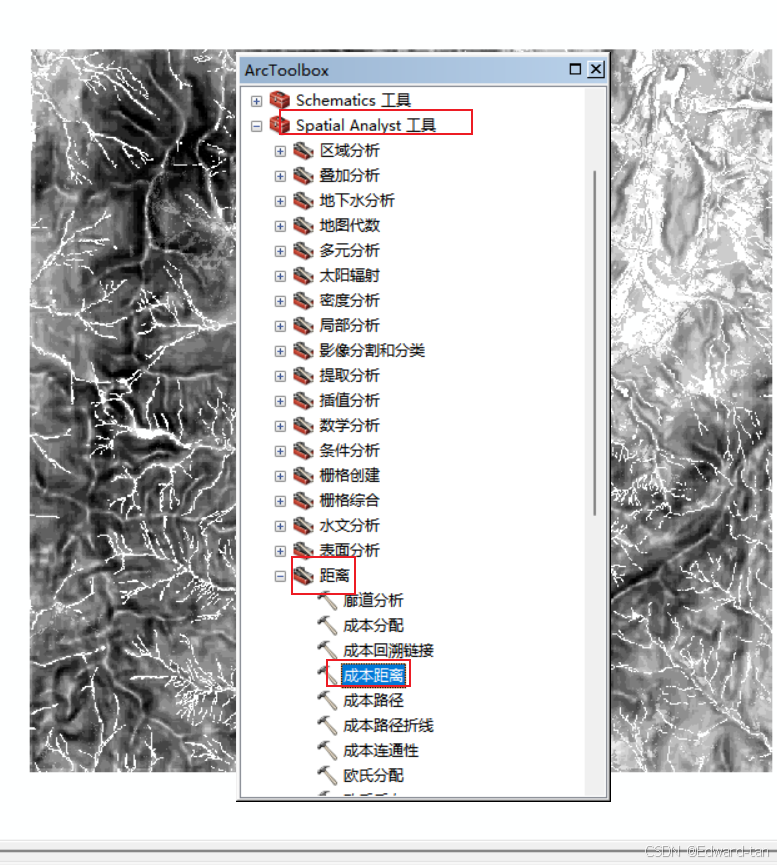 点击ArcToolbox中的【空间分析】-【距离分析】-【成本距离】。