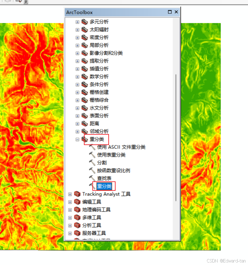 点击ArcToolbox中的【空间分析】-【重分类】-【重分类】。
