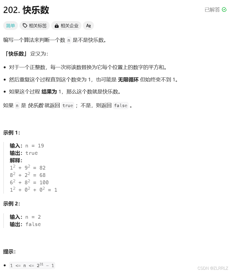 这里需要补充的是根据鸽巢定理,n个巢穴,n + 1个鸽子,,将鸽子都安排进巢穴,那么不管怎么安排,至少有一个有一个巢穴里面鸽数大于1,我们这里取一个超过int范围的9999999999,我们按照上诉操作进行一次,数值变为810,那么如果我们继续对810变形,我们就会发现在这个过程中出现的数在[1,810]这个范围,这就意味着如果我们对9999999999变形超过810次,那么就一定会出现与[1,810]中数值重复的数。