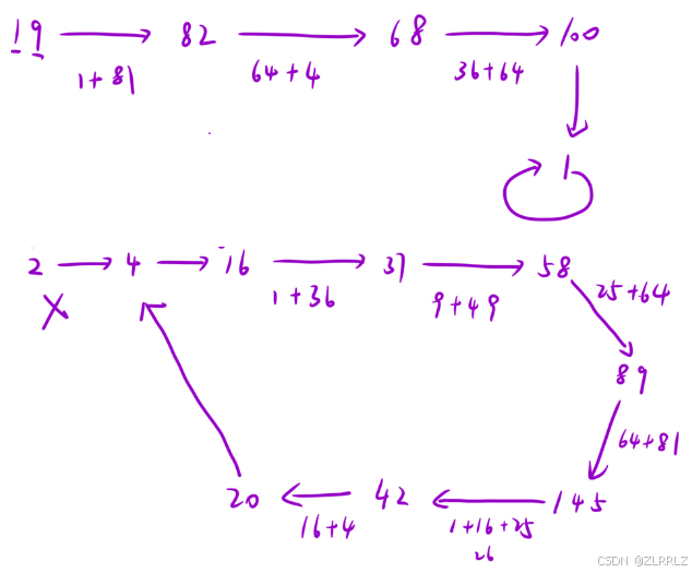 对于一个正整数我们替换为它每个位置上数字的平方和,不断重复这个过程就如上图所示。