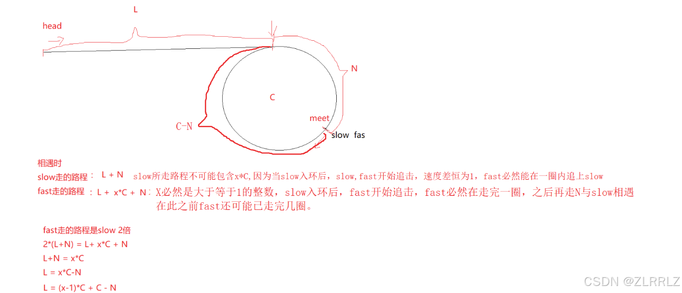 我们可以看到L=(x-1)*C+C-N,因此,当head走完L的路程,mee会走完(X-1)圈回到fast、slow相遇的位置,再走C-N走到开始入环的第一个节点与head相遇。