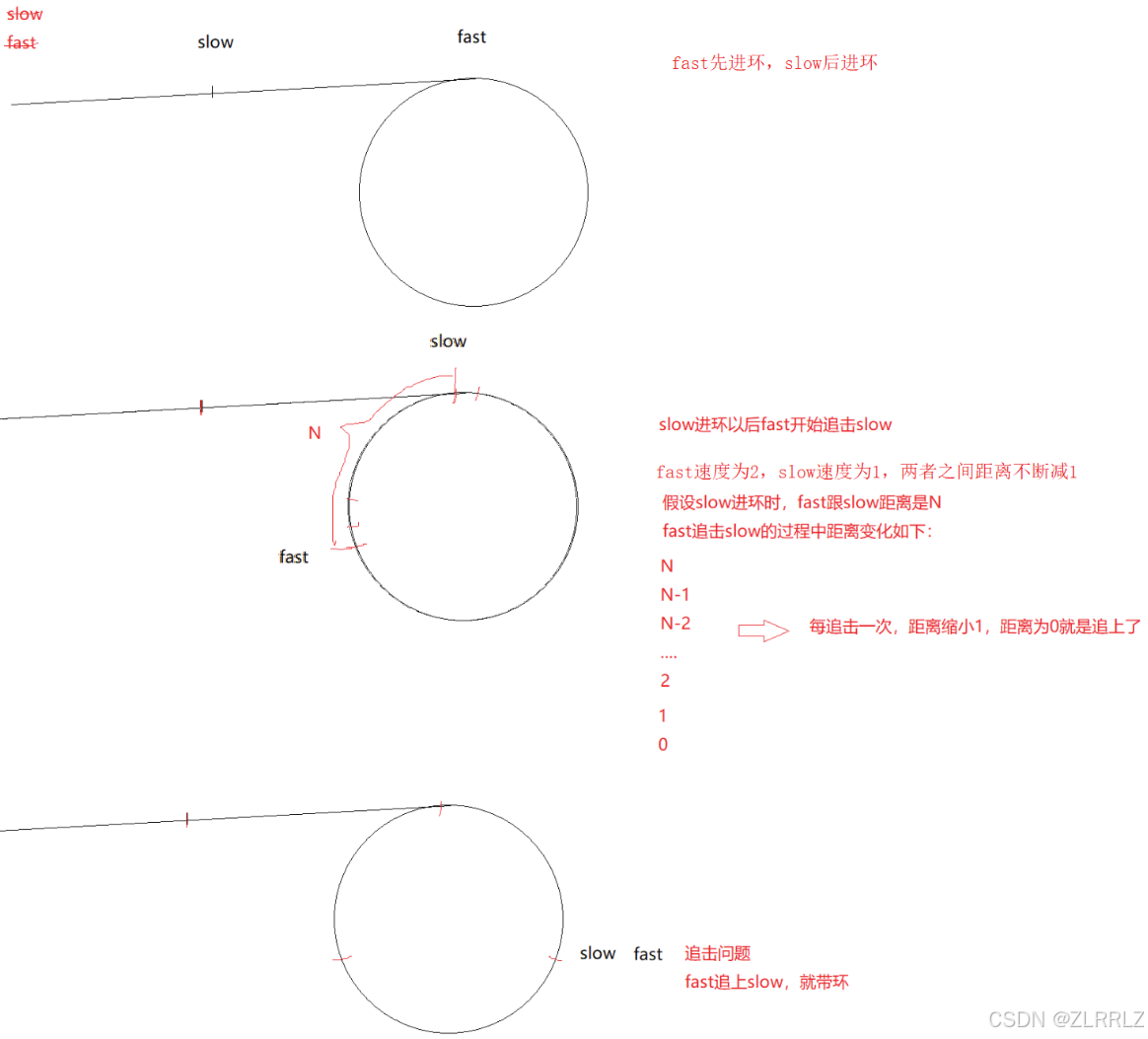 首先存在两个指针fast、slow,fast一次走两步,slow一次走一步,那么,如果fast、slow遍历一个带环链表,fast、slow是否会相遇呢?结论是如果如果链表成环,fast与slow一定会成环,并且相遇的位置就是环的节点