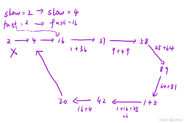 回过头来我们发现这道题的计算过程就可以视作一个带环的链表(变为1的过程,可以视作1这个节点独自成环,1变化后还是1),因此,根据我们的前置知识,我们采用快慢指针来完成这道题目,fast一次走两步,slow一次走一步(指针这里只是一种抽象概率,大家不要被迷惑,我们这里可以通过fast一次计算两次,slow一次计算一次模拟。)
