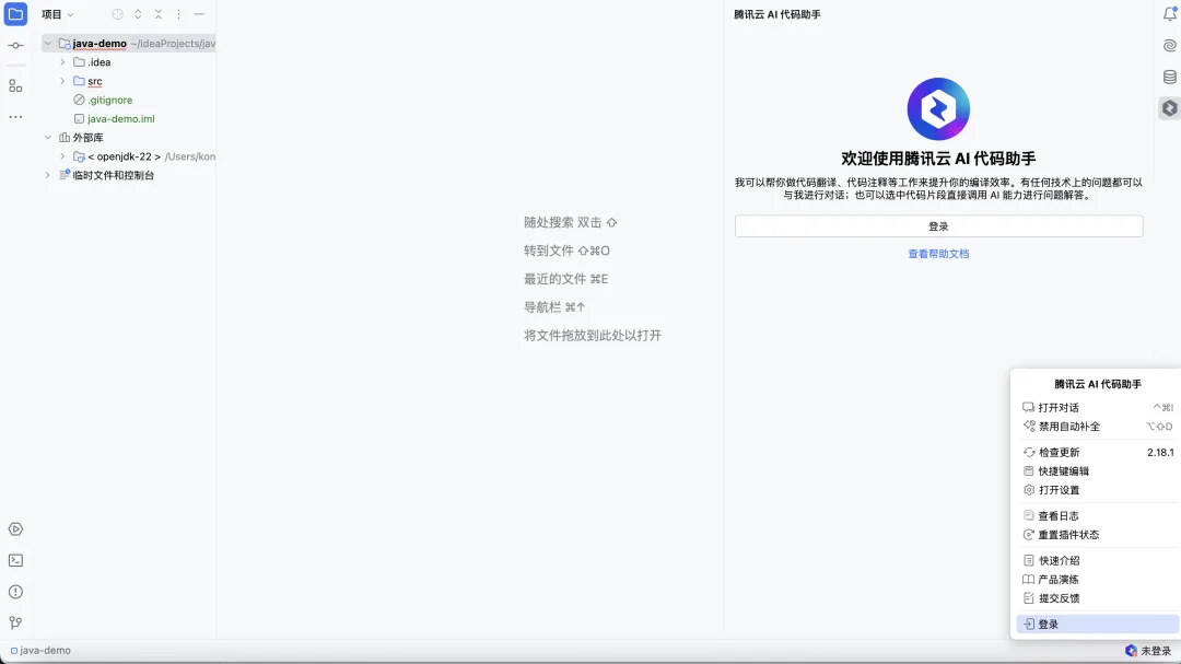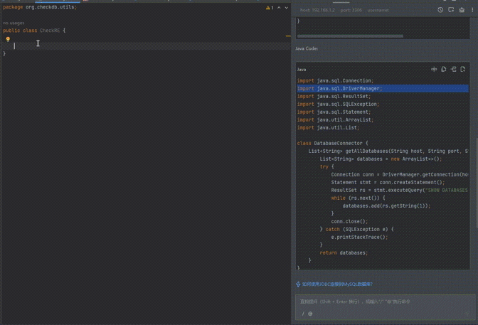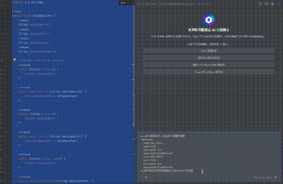 目前我使用的开发语言是Java,主要在 IntelliJ IDEA 开发,选用 Java 开发的原因主要是个人习惯,对 Java 比较熟悉,不过也是第一次去开发类似腾讯这种数据库扫描工具,类似 T- Sec 数据安全审计,挖掘数据库运行过程中各类潜在风险和隐患的扫描小工具,还是有些挑战。所以我选择采用目前对比体验效果比较不错的「腾讯云 AI 代码助手」。