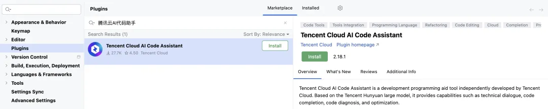 首先我们从安装插件开始,打开 IntelliJ IDEA ,通过 Settings->Plugins->搜索腾讯云 AI 代码助手,点击 Install