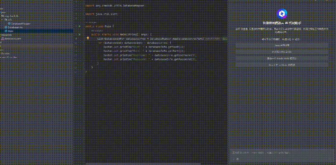 在 mian 中绑定 yaml 和类,在工具启动时映射 dataeaseinfo 对象中,这部分代码我们使用腾讯云 AI 代码助手帮我们生成一个简单的例子,我们简单修改完成。我们可以通过问答的方式获取相关例子