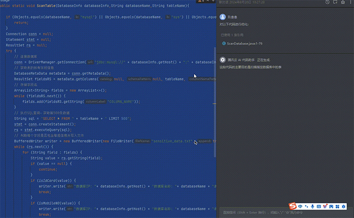 最后,通过编写工具扫描逻辑,由于数据表中的数据非常多,全表扫描存在性能问题,因此并不可取,本次,我们以每次获取每张表的前 500 条数据进行判断,如果存在敏感数据,我们记录到文件中,依然腾讯云 AI 代码助手生成代码