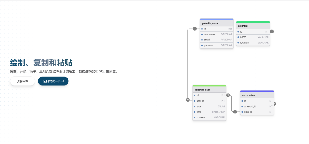 drawDB是一个开源、简单、直观、强大且用户友好的在线数据库设计工具和 SQL 生成器,支持多种数据库。只需点击几下即可构建图表,导出SQL脚本,可以自定义编辑器等,并且无需登录即可使用。