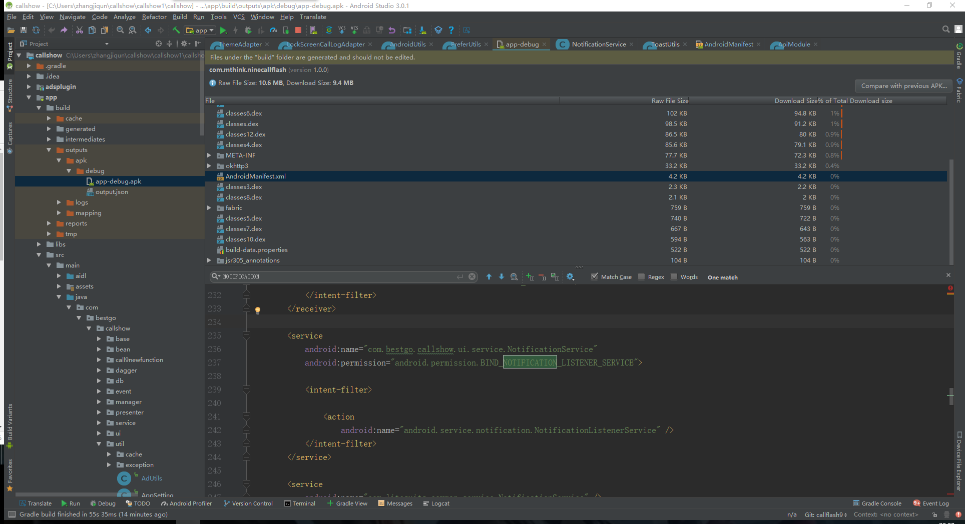 2.选中 AndroidManifest.xml, 在下面的使用快捷键:Ctrl  +  F,进行搜索,NOTIFICATION。或者你对应的权限。