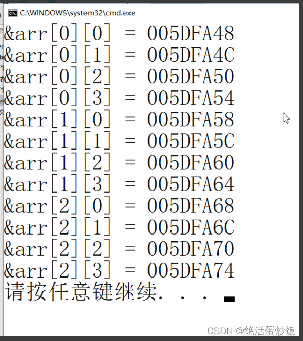 仔细观察输出的结果,我们知道,随着数组下标的增长,元素的地址,也在有规律的递增。 由此可以得出结论: 数组在内存中是连续存放的。(由低到高)