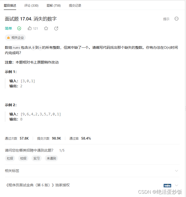 数组nums包含从0到n的所有整数,但其中缺了一个。请编写代码找出那个缺失的整数。你有办法在O(n)时间内完成吗?