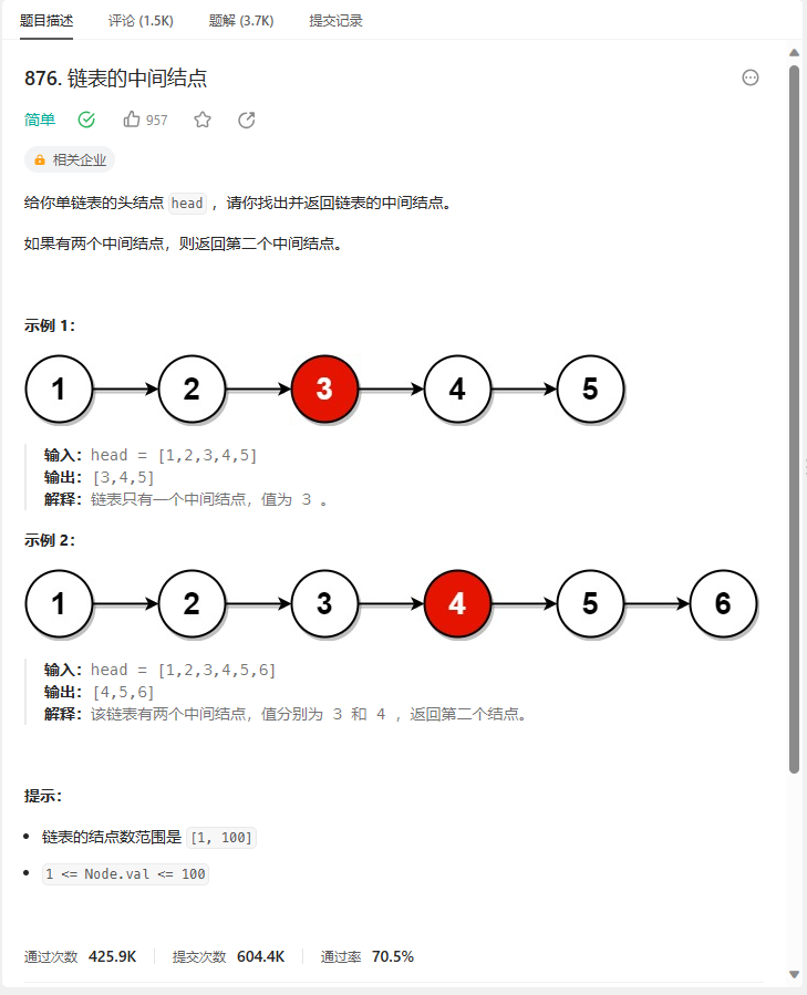 /* 解题思路: 通过快慢指针找到中间节点,快指针每次走两步,慢指针每次走一步,当快指针走到结尾的时候,慢指针正好走到中间位置 */