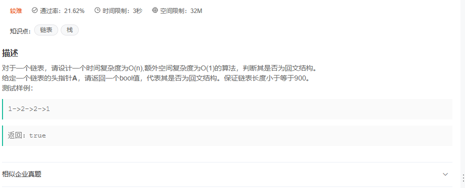 };/* 此题也可以先把链表中的元素值全部保存到数组中,然后再判断数组是否为回文。不建议使用这种解法,因为如果没有告诉链表最大长度,则不能同此解法 */