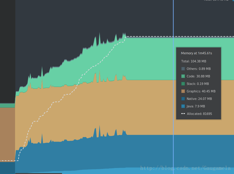 从图中可以看出app消耗的内存飙升到了104M, 与初始化后的内存相比,其中增加主要是code和native类型的内存。