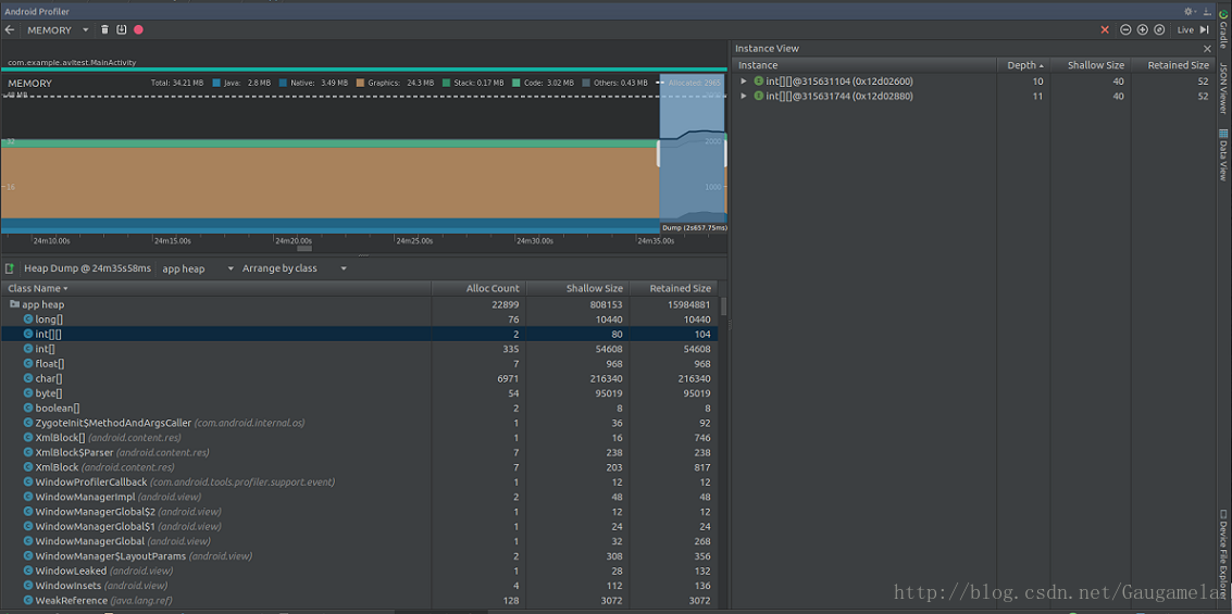 选定观察区域后, Memory Profiler就可以统计这段时间内app分配内存的情况: 从图中可以看出,Memory Profiler可以显示分配对象的类名; 点击类后,会在Instance View显示具体的对象; 点击具体对象后,会在Call back区域显示调用栈。 点击调用栈信息后,就会跳转到具体的代码。