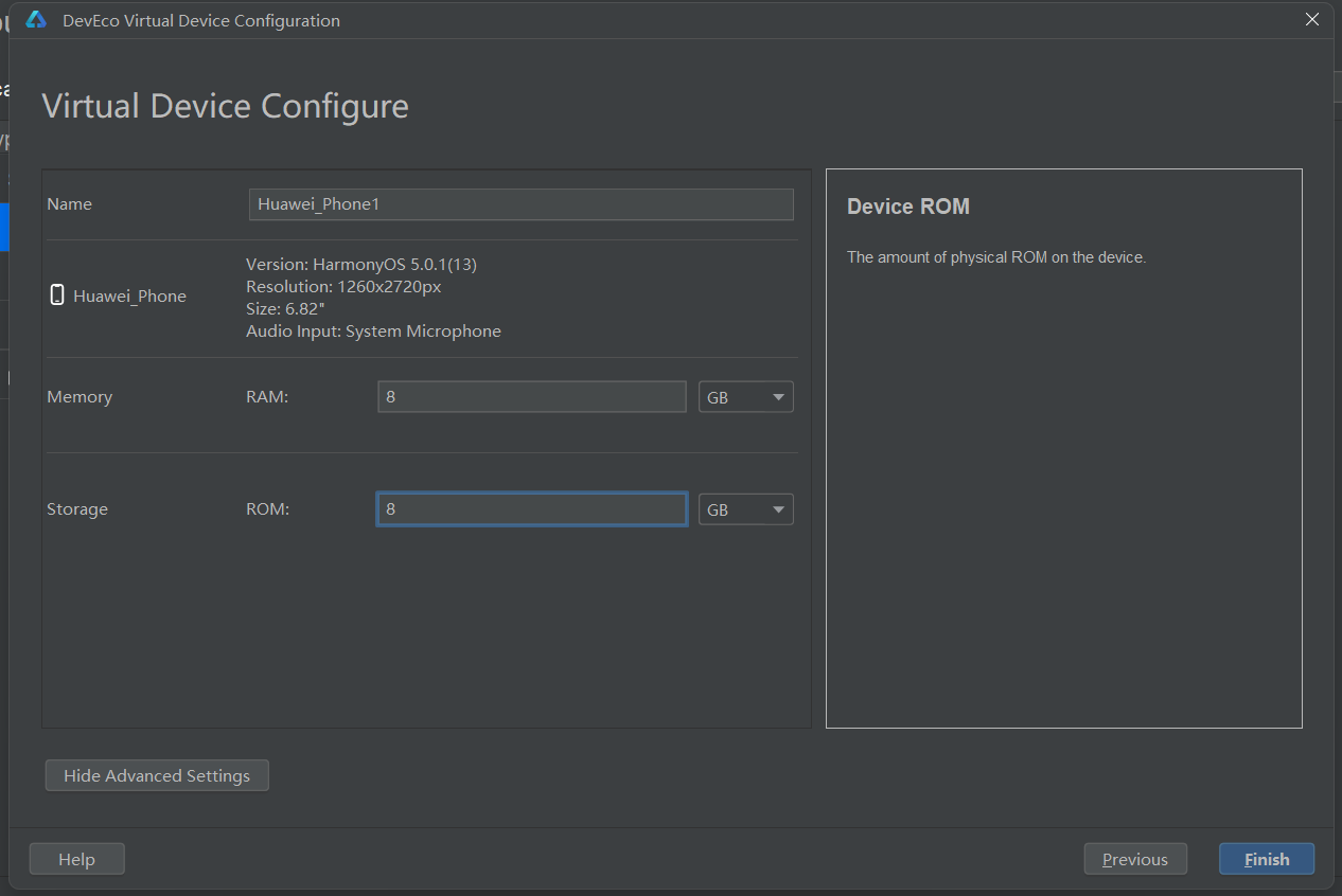 请填写虚拟设备的相关信息,您可根据实际应用需求进行相应调整。此处以 8/8 为例进行演示,填写完毕后点击“Finish”以进入下一环节。
