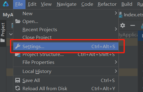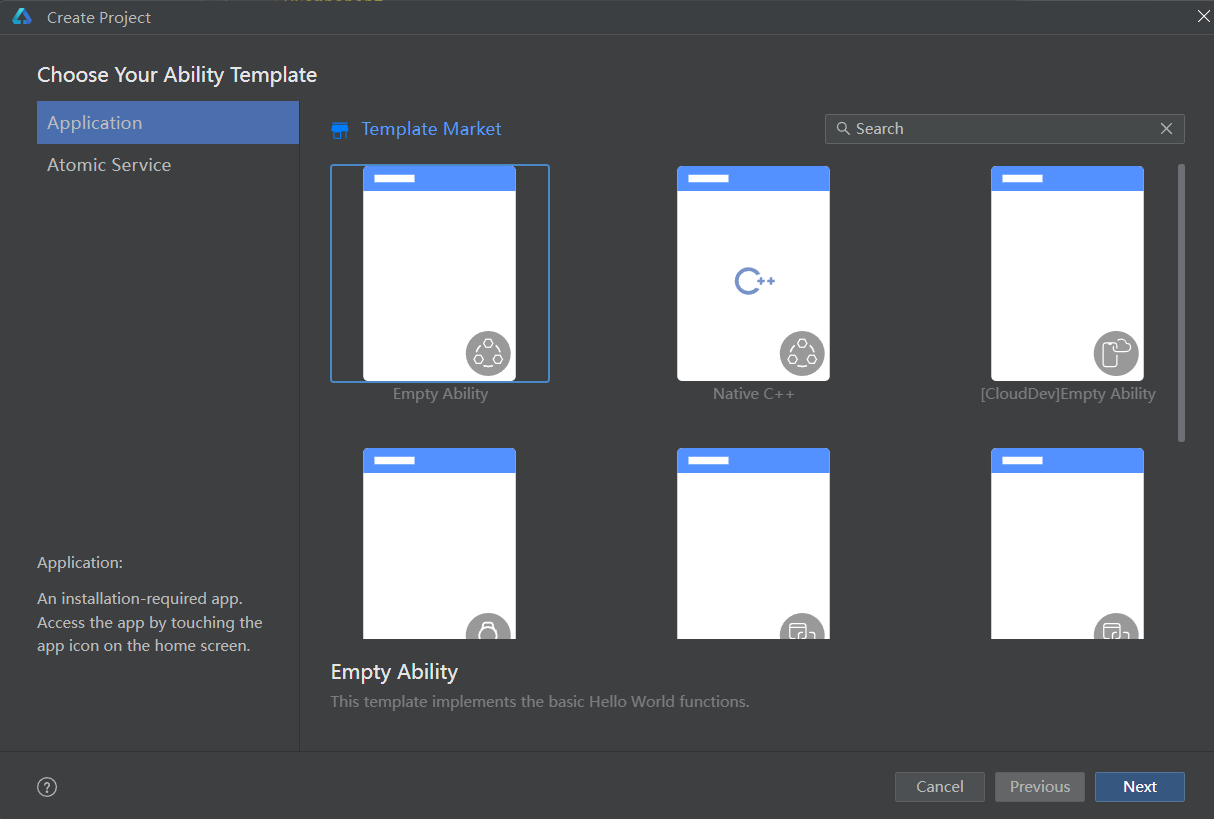 在欢迎界面中,请选择左侧栏的“Projects”。您可以选择“Customize”进行颜色主题等设置,或选择“Diagnose”进行环境诊断。点击左下角的齿轮图标可进行更多设置。接着,点击“Create Project”,选择“Application”->”Empty Ability”,然后点击“Next”。