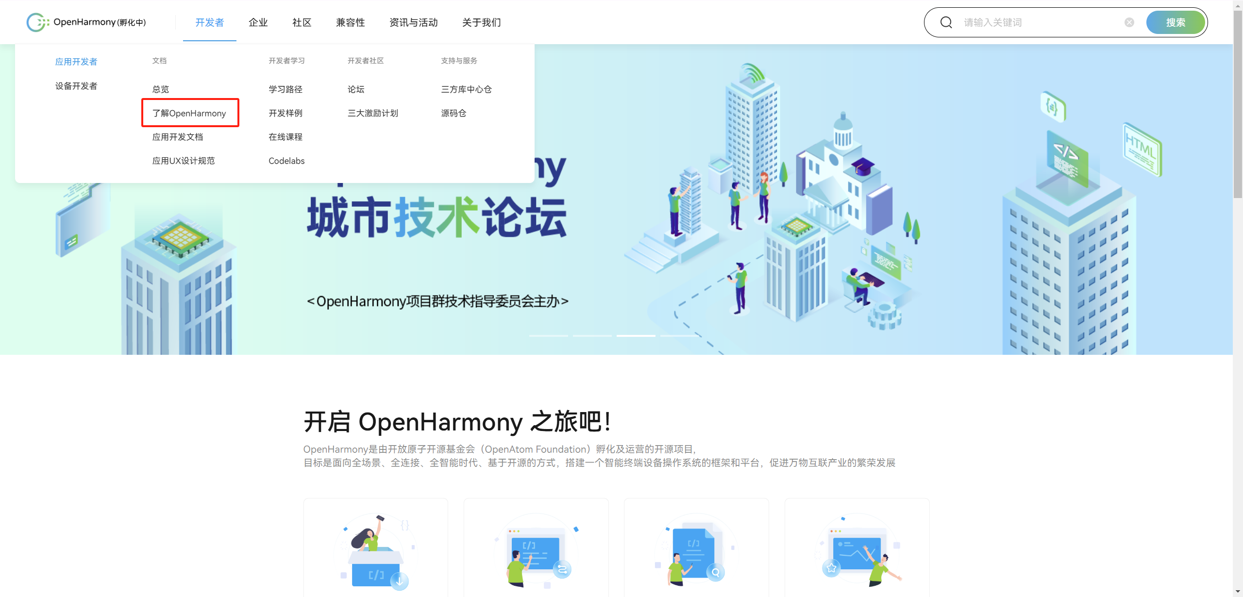 访问我们的官方网站后,敬请点击顶部导航栏中的“开发者”选项,随后进一步点击以获取关于OpenHarmony的详细信息。