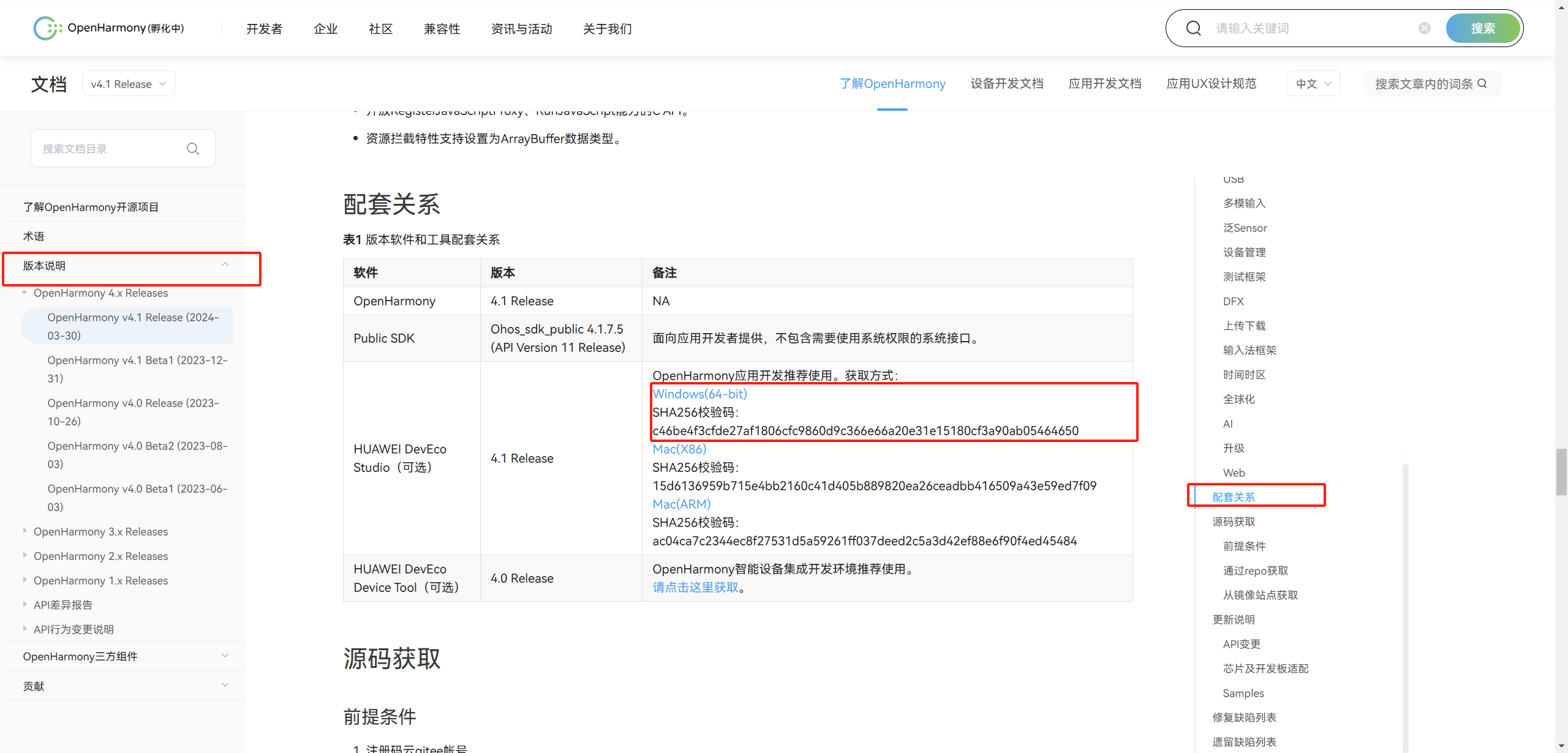 首先,我们需点击“版本说明”,在右侧的目录树中定位至“配套关系”,随后点击所需版本以进行下载。