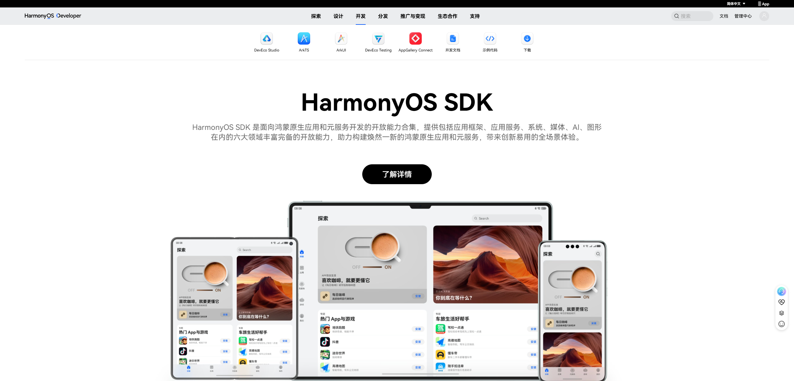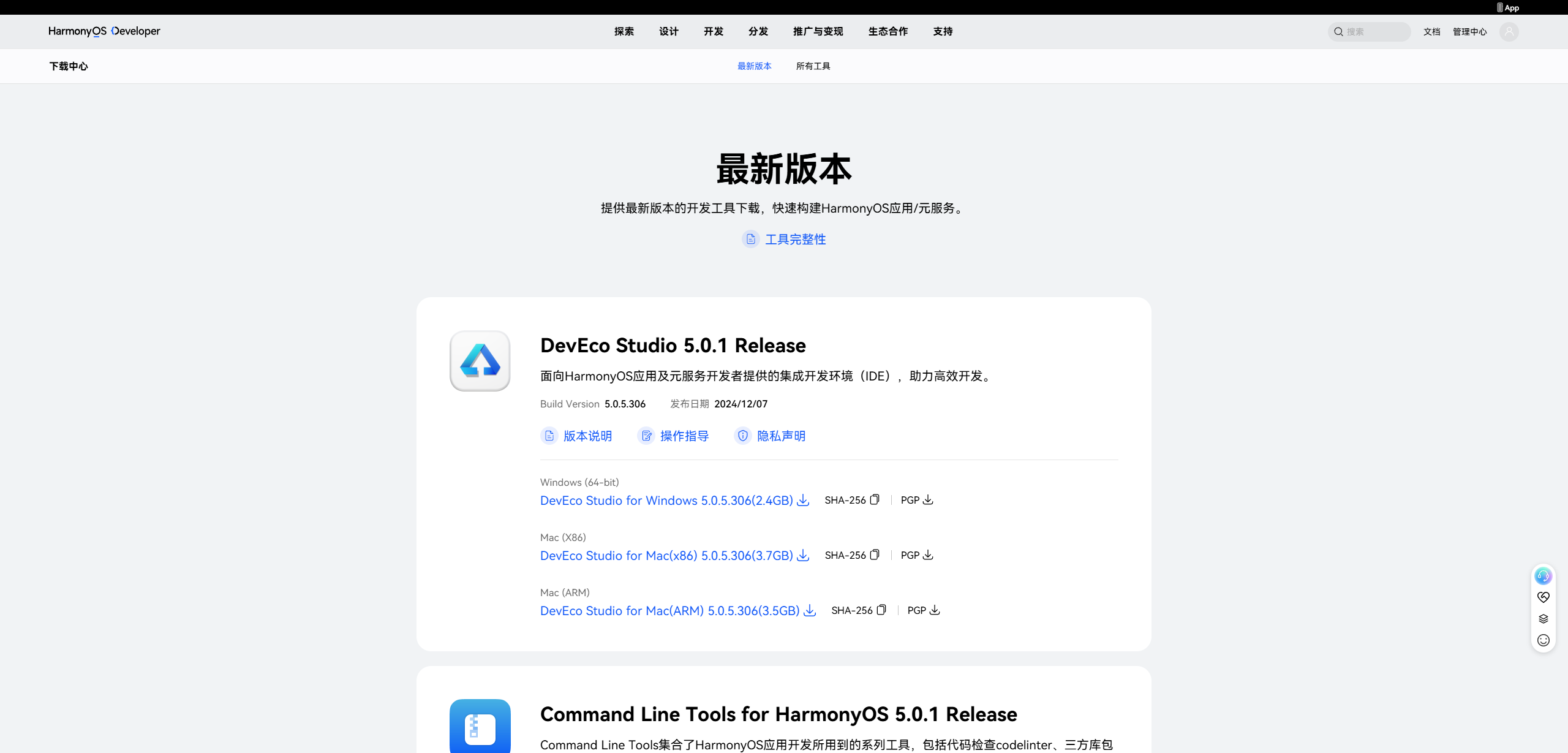 在访问HarmonyOS SDK官方网站时,您会在左上角看到DevEco Studio,这是我们所要寻找的工具。该工具的最新版本包含了默认SDK,除非有特殊需求,否则无需进行任何处理。