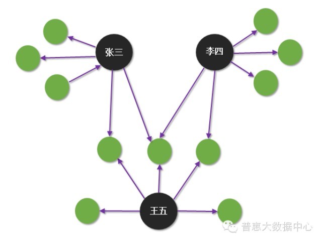 举一个简单的例子,有些组团欺诈的成员会用虚假的身份去申请贷款,但部分信息是共享的。下面的图大概说明了这种情形。从图中可以看出张三、李四和王五之间没有直接的关系,但通过关系网络我们很容易看出这三者之间都共享着某一部分信息,这就让我们马上联想到欺诈风险。虽然组团欺诈的形式众多,但有一点值得肯定的是知识图谱一定会比其他任何的工具提供更佳便捷的分析手段。