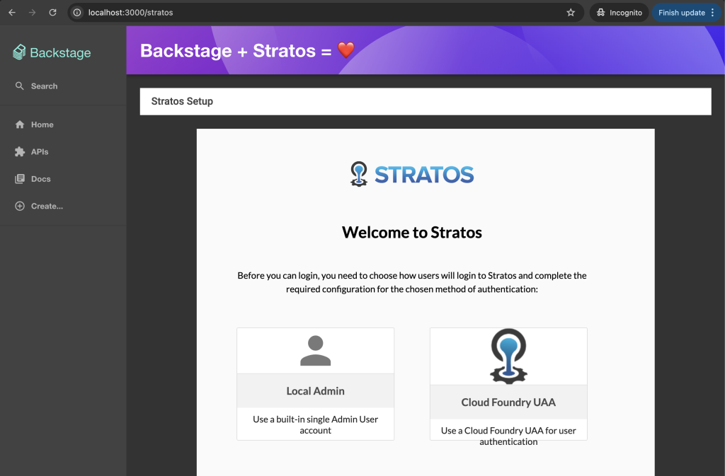 );我不会详细介绍配置文件,但需要注意的是,我们使用src="http://localhost:8080/"提供iframe服务,这会将Stratos界面显示到Backstage中。 我们与Backstage的工作完成了;现在,让我们开始使用Stratos。