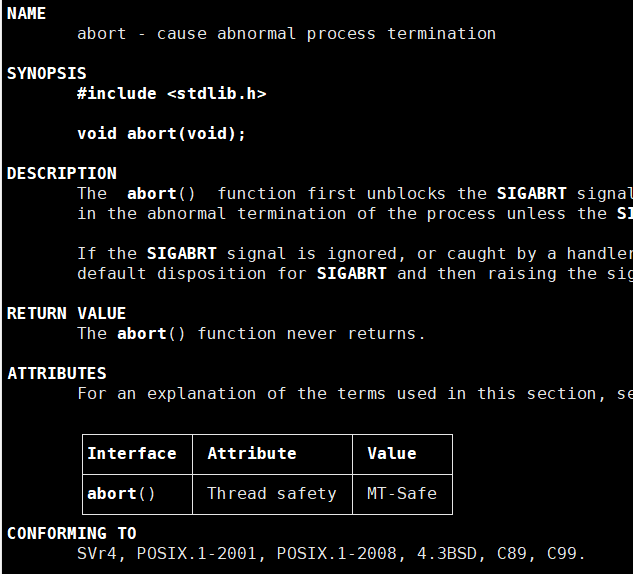 所在库: #include <stdlib.h> 函数原型: void abort(void);