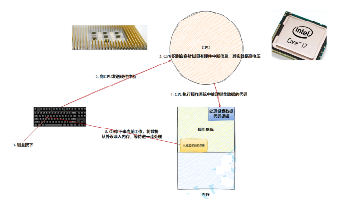 当我们键盘按下以后,键盘通过电路(高电压)向CPU的针脚发送中断信息,CPU执行操作系统保存当前进程的代码和数据,然后操作系统停下来去读取外设的内存。