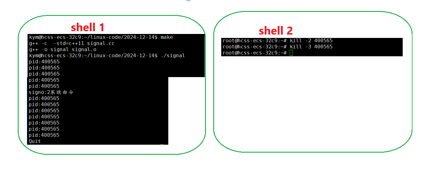 }因为是前台进程,我们只能通过另外一个shell对死循环的进程发送2号信号,3号信号。发送2号信号,打印2号信号的数字2,还有系统命令。