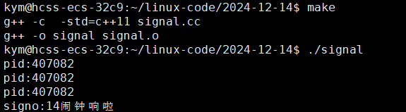 std::cout << "signo:" << signo << "闹钟响啦" << std::endl;