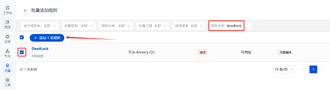 进入页面,点击方案->规则配置 -> 自定义规则包-> 添加规则 ->搜索规则名DeadLock->选择需要添加的规则 ->批量添加规则
