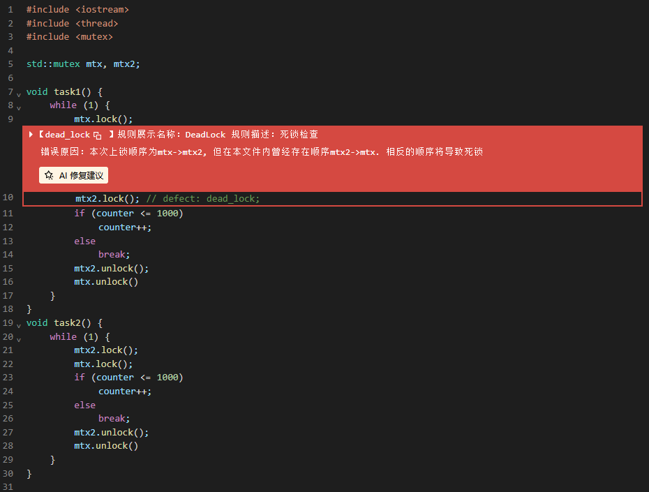 死锁是一个日常编码过程中常见的问题,它发生在两个或多个线程或进程互相持有对方所需的资源而无法继续执行的情况。死锁不仅会导致程序无法继续执行,还可能导致系统资源浪费和性能下降。为此,TCA推出自研规则DeadLock,帮助开发有效规避此类问题。