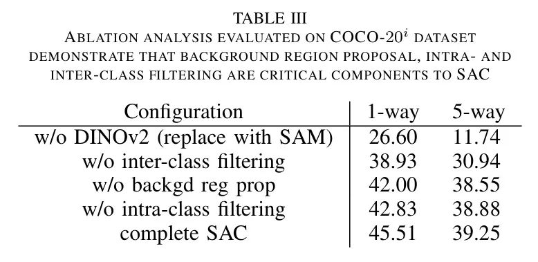 作者的消融研究突显了作者的SAC模型中不同组件的影响。表3显示,特征表示网络对分割精度的影响最大。SAC使用DINOv2生成目标特征,并用SAM图像编码器替换,导致性能显著下降。类间过滤在去除错误的类 Prompt 方面发挥了关键作用,其消除导致了性能的次大下降。作者的区域分类仍然是一种固有噪声算法,因此通过类间过滤去除错误 Prompt 可以显著提高分割 Mask 精度。类内过滤和背景区域 Proposal 的影响较小,但仍然是最大限度提高整体性能的关键组成部分。类内过滤移除非相似度得分较低的区域,而背景区域 Proposal 将负 Prompt 与正 Prompt 配对,从而提高了 Mask 精度。