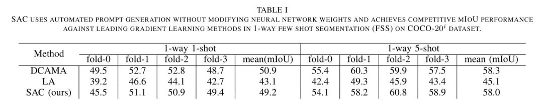 从II表格中,作者发现在5-way FSS中,DCAMA和LA的mIoU分数大约减半,而在1-way FSS中的表现则没有这种趋势。作者的SAC方法显著超越了DCAMA和LA的性能,随着类别数增长,性能差距不断扩大。SAC似乎在类别数增加时缓解了分割精度下降的趋势,这表明了仅 Prompt 和梯度学习无用的方法的鲁棒性。作者认为,由于没有更新模型权重,有效的特征表示不会被替代,从而提供了一定的抗遗忘能力。