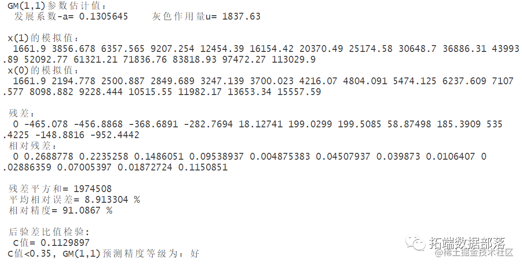 for(w in 1:(t-1)){ #将a,u的估计值代入时间响应序列函数计算x1拟合序列y