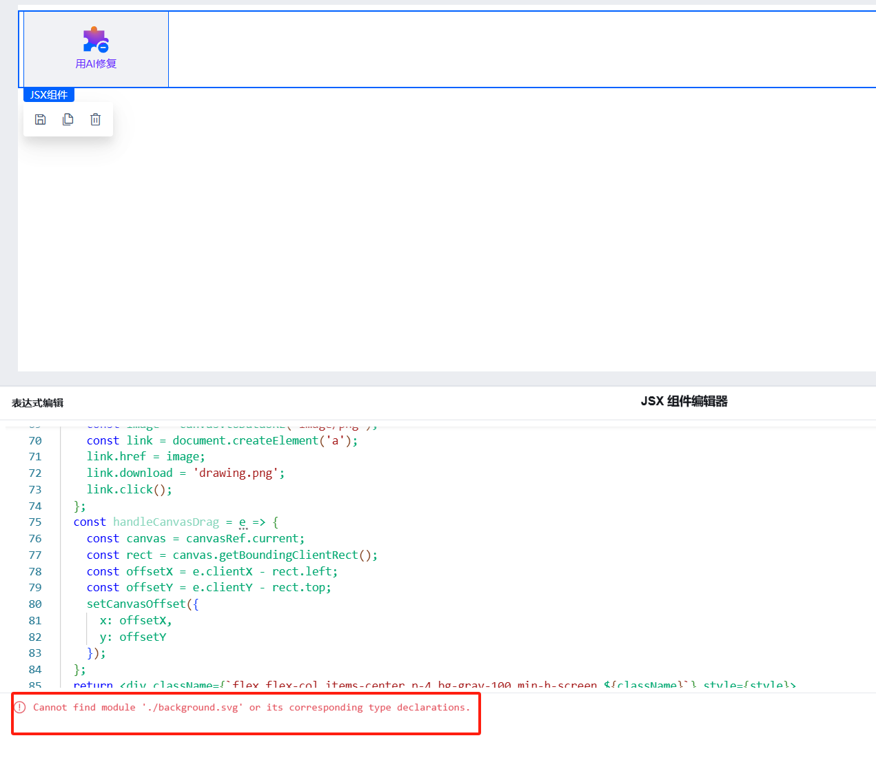 在生成完代码后,我们发现贷中有静态资源找不到,导致程序报错,此时,我们可以通过用AI修复进行处理。