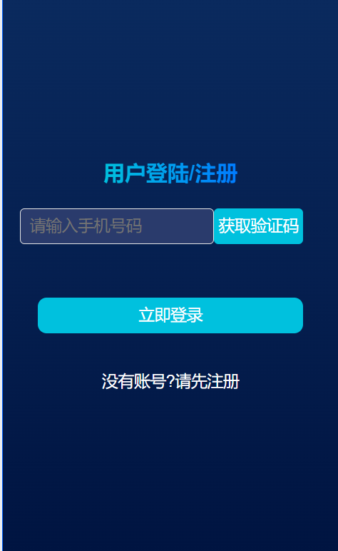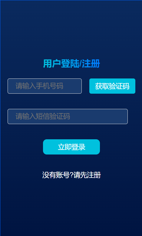 该图片包含用户登陆/注册标题,手机号码输入框,短信验证码输入框,获取验证码按钮和登录按钮