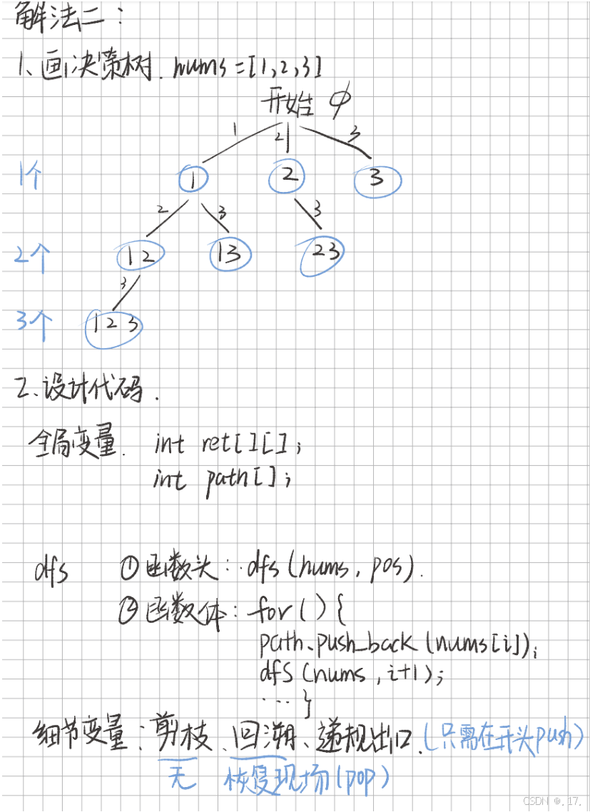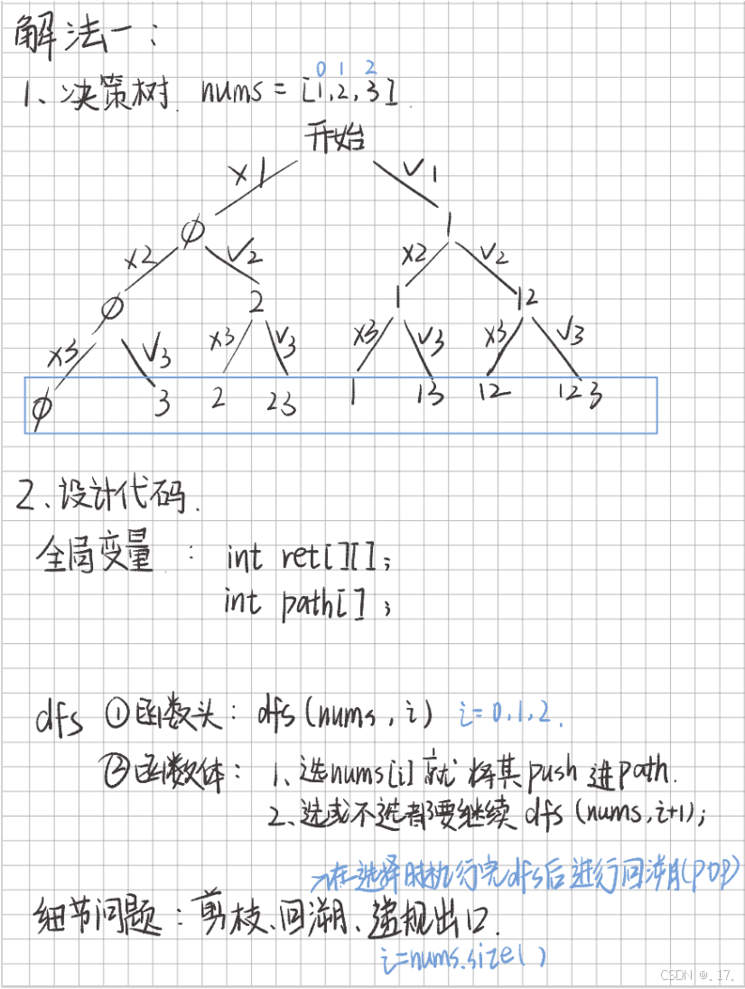 nums = [1, 2, 3]。pos 达到数组末尾(pos == nums.size())时,将当前路径 path 加入结果集 ret。dfs(nums, 0) path = [1],递归进入 dfs(nums, 1) path = [1, 2],递归进入 dfs(nums, 2) path = [1, 2, 3],递归终止,保存结果 [[1, 2, 3]]path = [1, 2]path = [1, 2],递归终止,保存结果 [[1, 2, 3], [1, 2]]path = [1]path = [1],递归进入 dfs(nums, 2) path = [1, 3],递归终止,保存结果 [[1, 2, 3], [1, 2], [1, 3]]path = [1],递归终止,保存结果 [[1, 2, 3], [1, 2], [1, 3], [1]]path = []path = [],递归进入 dfs(nums, 1) path = [2],递归类似上面。path = [],递归继续处理后续。最终得到所有子集。
