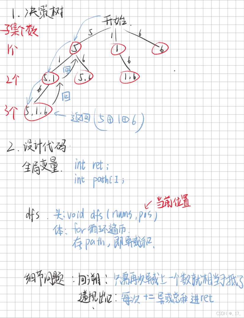 pos 为起点的所有可能子集。ret。ret: 每次递归进入时,将当前路径的异或值(path)加入到结果中。pos 开始,逐一尝试将后续元素加入路径 path,并递归处理。path 的值)。pos 超出数组范围时,循环自动结束。在主函数 subsetXORSum 中: