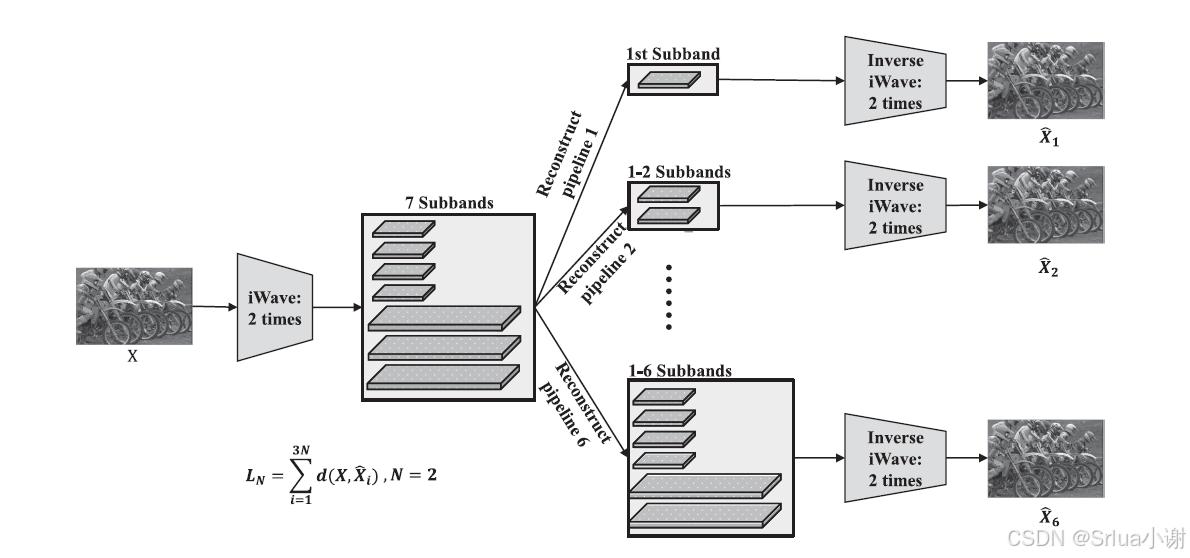 dd表示均方差,XiXi表示重建图像。 上述过程自然形成了一种端到端的训练策略。图5给出了这种训练结构的示意图,其中编码部分和解码部分分别对应于iWave的正向和逆向变换。需要注意的是,图5中显示了两次分解,但可以迭代使用iWave进行多次分解,以获得多分辨率表示。