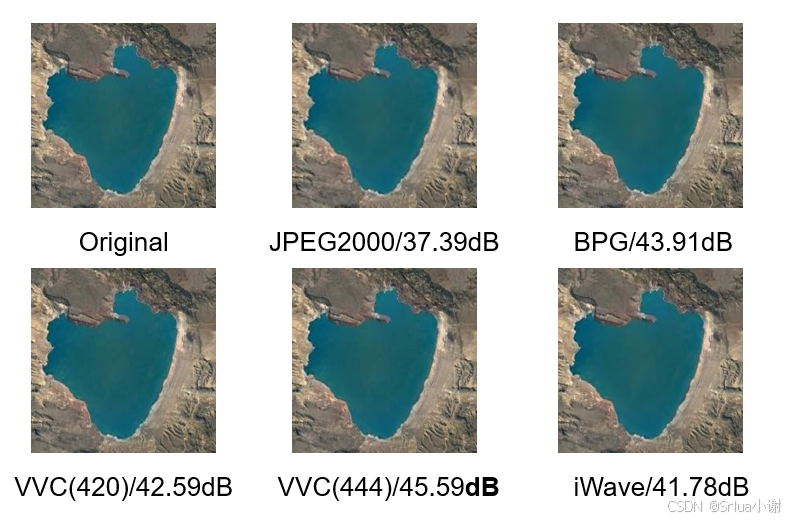使用RGB彩色遥感图像进行实验,将iWave方法与JPEG2000,BPG,VVC等传统的图像压缩编码方式进行对比,计算峰值信噪比可以发现,iWave的性能强于JPEG2000,但是相较于BPG和VVC更加复杂的编码实现来说,其编码性能上还存在一定差距。