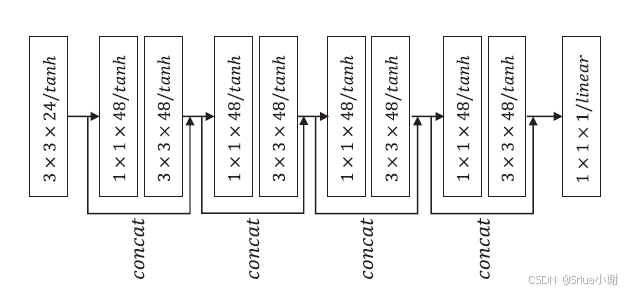 预测优先提升方案包括三个步骤:分割、预测和更新。 iWave采用了更新优先提升方案,实验表明其性能更好。本质上,用训练好的CNN替代了图1中的预测块。 iWave可以通过在行和列方向分别进行分解,从一维扩展到二维,类似于传统的小波变换。图3展示了iWave用于二维图像的整体变换结构。在行变换之后, iWave对图像进行分解的结果是四个子带:一个粗略子带LL,和三个细节子带HL、LH和HH。尽管iWave是分开进行二维变换,但由于CNN中使用的二维滤波器,它仍然能有效捕捉图像中的特征。 iWave的关键模块是由密集CNN(Dense CNN)实现的预测块,本文中具体的密集CNN结构如图4所示。由于小波具有局部支持基,这与传统提升方案中的滤波器阶数和iWave中CNN的接收域有关。较大的支持范围可以生成更平滑的粗略系数带,但也更可能无法表示图像的边缘。密集CNN实际上具有各种接收域,通过训练过程可以获得最适合自然图像的支持范围。选择使用密集CNN的另一个原因是,可以使用更少的卷积核,这有助于减少模型的规模。本文在每层使用tanh函数作为激活函数,除最后一层外,其他层均使用线性激活函数。需要注意的是,ReLU广泛使用,但在iWave中不适合。