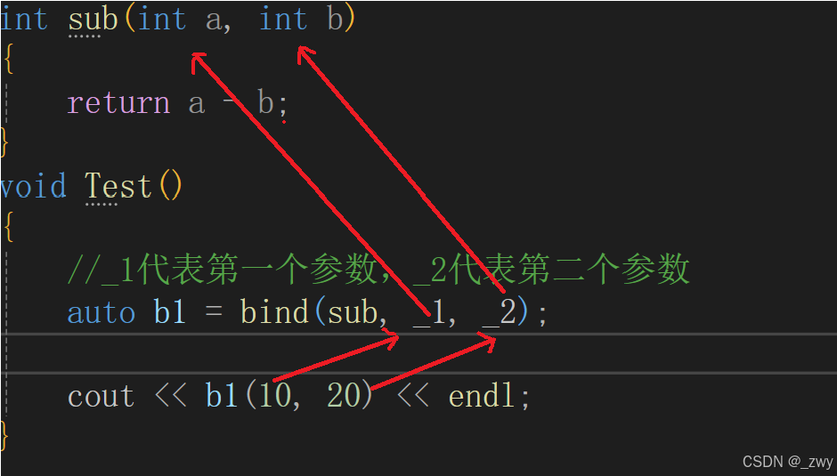 arg_list中的参数可能包含形如_n的名字,其中n是⼀个整数,这些参数是占位符,表示 newCallable的参数,它们占据了传递给newCallable的参数的位置。数值n表示生成的可调用对象 中参数的位置:_1为newCallable的第⼀个参数,_2为第⼆个参数,以此类推。_1/_2/_3....这些占 位符放到placeholders的⼀个命名空间中。