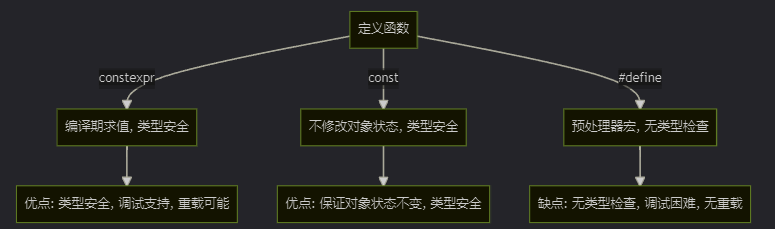 constexprconst#define#define更简洁。#define可能更通用。constexprconst#define可以看出constexpr在现代C++中提供了更强大的功能和更好的类型安全性,适合于需要在编译期进行计算和优化的地方。const则在保证变量或对象状态不变方面有其独特的用途,而#define在一些特定的场景中仍有其简洁性和兼容性的优势。选择使用哪种方式定义常量或函数应根据具体的需求和代码的上下文来决定。