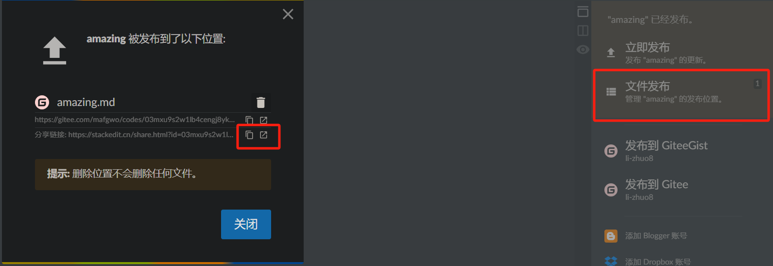 4. 点击文件发布,选择复制链接或者直接弹出浏览器都可以打开你的共享笔记