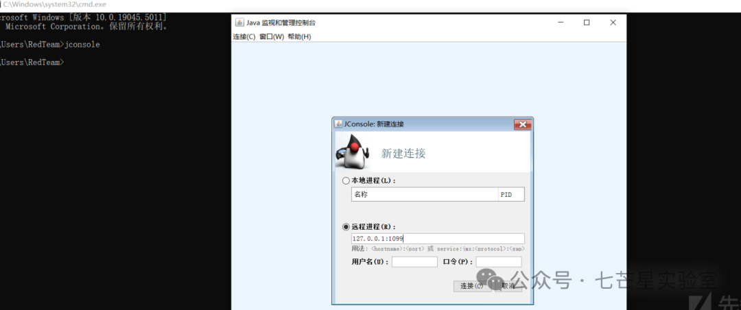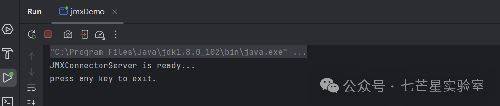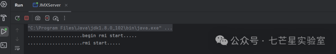 importjavax.management.MBeanServer;importjavax.management.remote.JMXConnectorServer;importjavax.management.remote.JMXConnectorServerFactory;importjavax.management.remote.JMXServiceURL;importjava.io.IOException;importjava.lang.management.ManagementFactory;importjava.net.MalformedURLException;importjava.rmi.registry.LocateRegistry;publicclassJMXServer{publicstaticvoidmain(String[]args)throwsException{MBeanServermbs=ManagementFactory.getPlatformMBeanServer();try{LocateRegistry.createRegistry(9999);JMXServiceURLurl=newJMXServiceURL("service:jmx:rmi:///jndi/rmi://127.0.0.1:9999/jmxrmi");JMXConnectorServercs=JMXConnectorServerFactory.newJMXConnectorServer(url,null,mbs);System.out.println("....................begin rmi start.....");cs.start();System.out.println("....................rmi start.....");}catch(MalformedURLExceptione){e.printStackTrace();}catch(IOExceptione){e.printStackTrace();}}}
