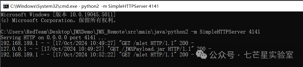 Step 4:随后使用python来启动一个简单的HTTP服务托管JMXPayload.jar